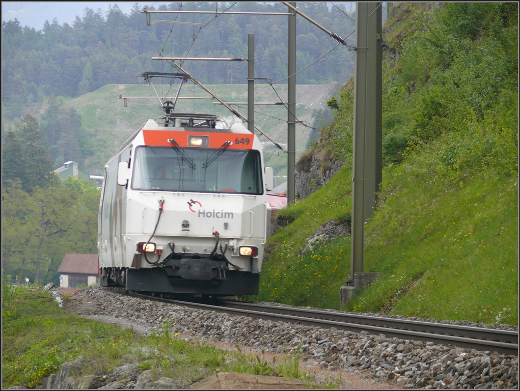Der GlacierExpress 909/911 ist ein stattlicher Zug und besteht eigentlich aus zwei Zügen, die in Disentis beim Übergang auf die Zahnradstrecke der MGB geteilt werden. Hier fährt er durch den "Grand Cañon" bei Trin. (20.06.2010) Herbert Graf