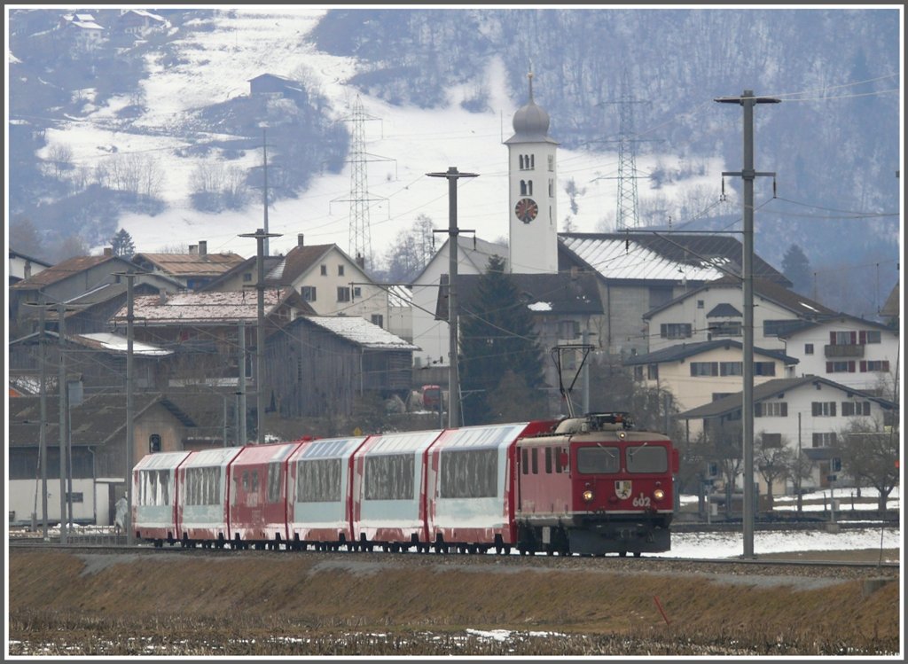 Der GlacierExpress 900 verschwindet unterhalb von Castrisch in der Rheinschlucht. Auf der gegenüberliegenden Seite grüsst die Kirche von Sagogn (sprich Sagoin, oder spasseshalber auch schon mal Saigon) (09.03.2010) Herbert Graf