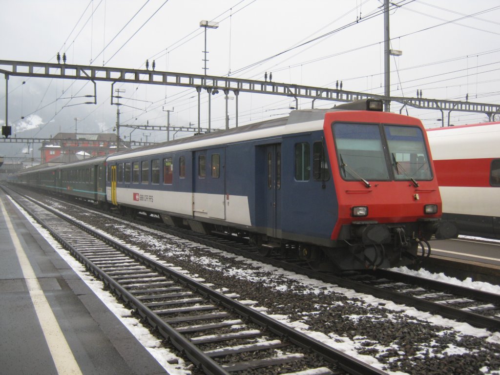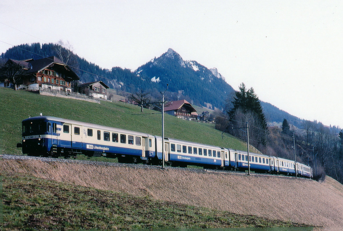 BLS/SEZ/SBB: Im Jahre 2001 wurden die Schulklassen für die verschiedenen Skilager mit verstärkten Planzügen nach Zweisimmen transportiert. Somit entstand ein gemischter Zug bestehend aus 5 BLS Wagen (inkl. Bt) + Ae 4/4 als Zwischenlok + 7 SBB Wagen. Wie die im Januar 2001 bei Oberwil entstandene Aufnahme zeigt, erreichte dieser Zug Zweisimmen am frühen Morgen, wo die Sonne leider zu dieser Jahreszeit noch fehlte.