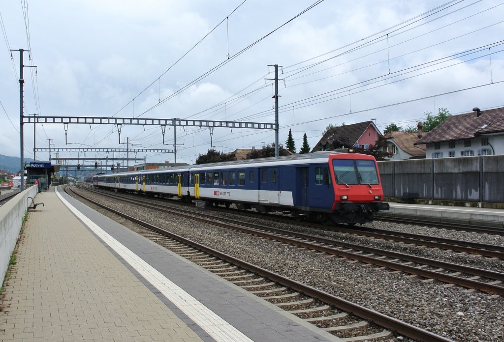 Ersatz IR 2020 bei Durchfahrt in Rothrist. Anstelle eines ICN verkehrte heute ein 6-teiliger RBe Pendel. An der Spitze einer der beiden letzten BDt EWI "hässliches Entlein", 50 85 82-33 953-9, 02.07.2012. Simon Bütikofer