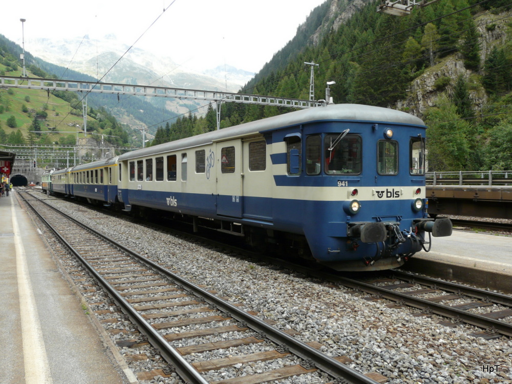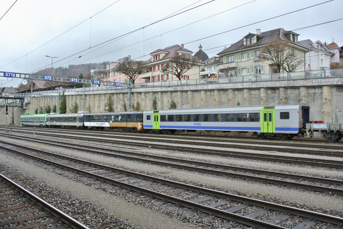 Seit Fahrplanwechsel ist der Goldenpass Pendel der BLS Geschichte. Der BDt steht immer noch in Spiez, und wartet auf sein weiteres Schicksal. Der Steuerwagen wurde abgedreht, nun ist der Führerstand Seite Westen: v. r. n. l.: B Lego 50 85 20-35 544-9, BDt Goldenpass 50 63 82-33 940-2, A EWI Salon Bleu 50 63 89-33 837-3 und Ralpin Bcm 61 85 59-00 112-7 (ex. SBB) abgestellt in Spiez, 25.12.2013. Simon Bütikofer
