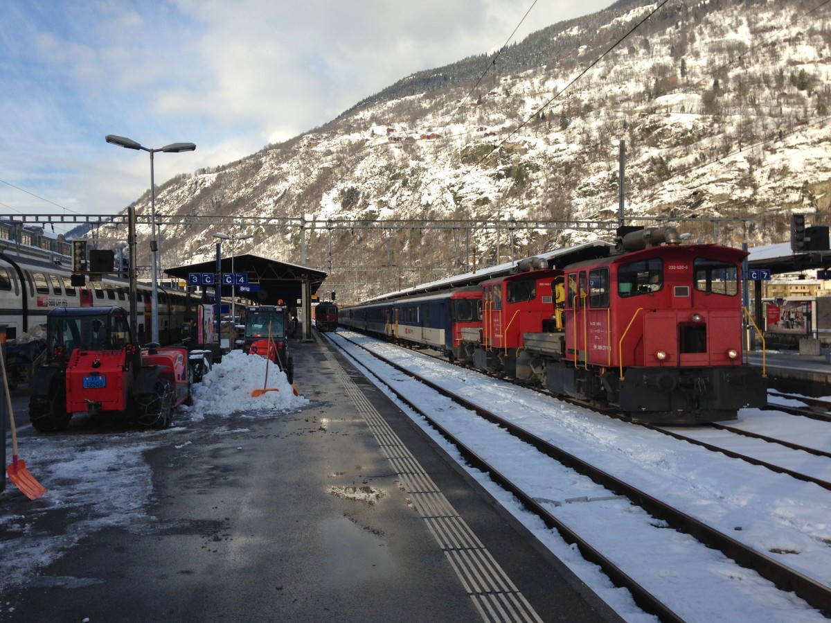 Winterdienst bei der SBB; der Schnee wird mittels dem Bagger links im Bild auf die beiden Tm rechts im Bild verladen. Da die Mannschaft gerade in der Pause ist wurden die Tm 232 020-8 und 232 042-2 vor dem abgestellten EWI Pendel, mit dem BDt 50 85 82-33 962-0, beiseite gestellt, Brig, 28.01.2015. Simon Bütikofer