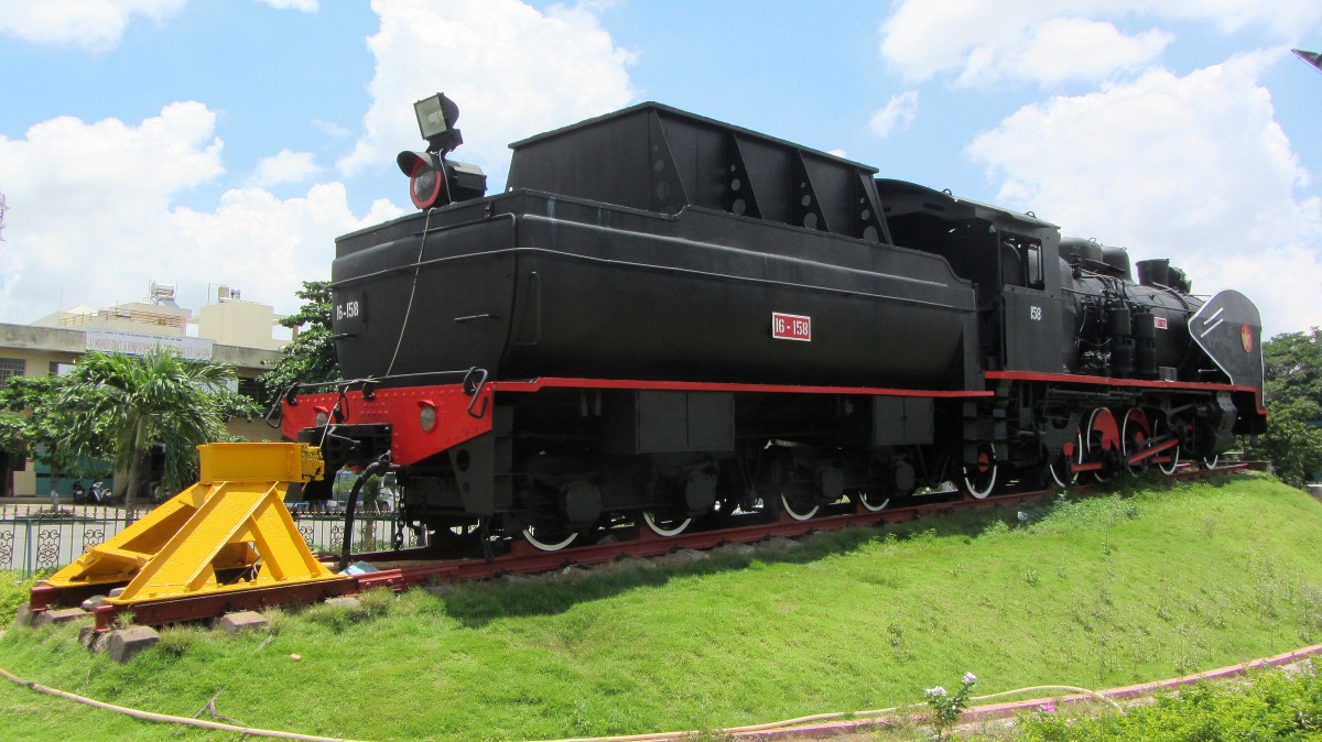 Eine ausgestellte, vietnamesische Dampflok vor dem Bahnhof in Saigon.(28.8.2013)