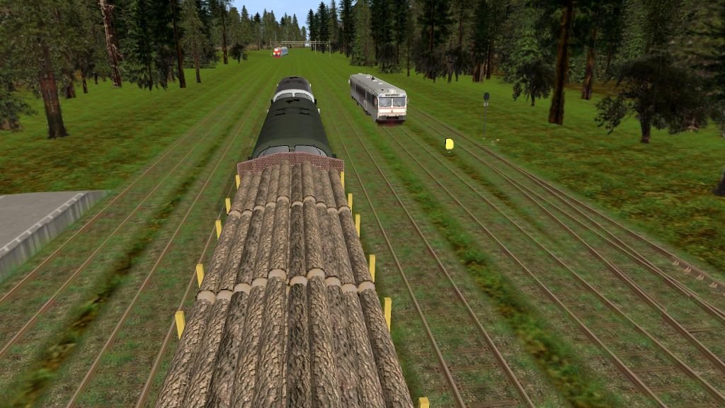 Tagab TMY 106 und TMY 103 ziehen einen Holzzug durch einen kleinen Rangierbahnhof irgendwo im Nirgendwo, während ein PMV2000 von Banverket auf die Weiterfahrt wartet. Hendrik Röben