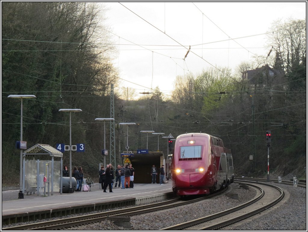 Wenn Fliehkräfte wirken! Hier drückt es den Thalys ganz schön nach aussen im Gleisbogen am Bahnhof von Eschweiler (Rhl). Bildlich festgehalten im April 2013. Stefan Jakab