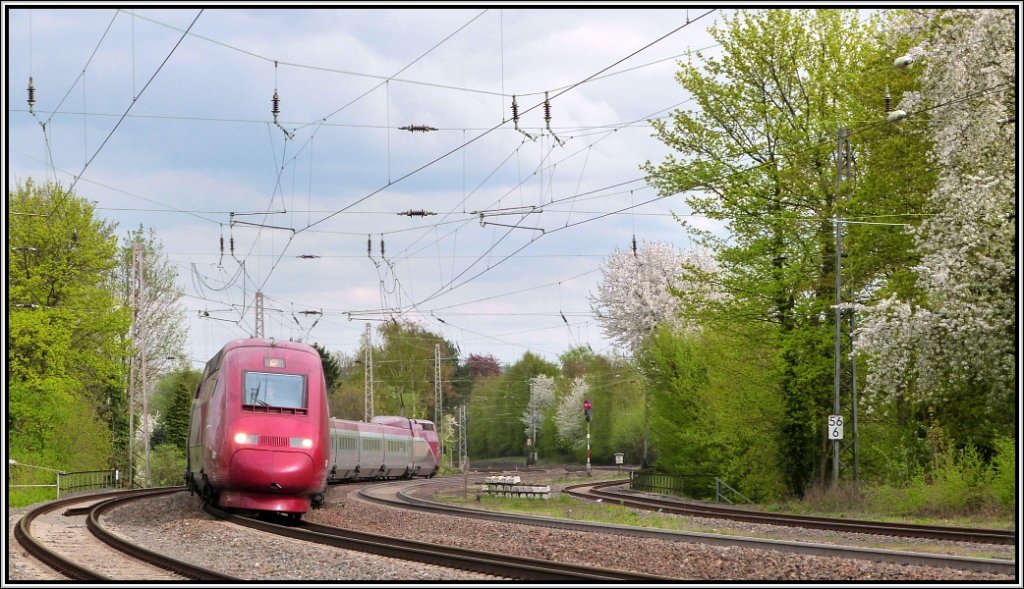 Bei schönsten Sonnenschein erstrahlt der Thalys im vollen Glanz. Hier auf der Fahrt in Richtung Aachen HBf, und dann weiter bis Paris. Aufnahme vom 14.04.2013 im