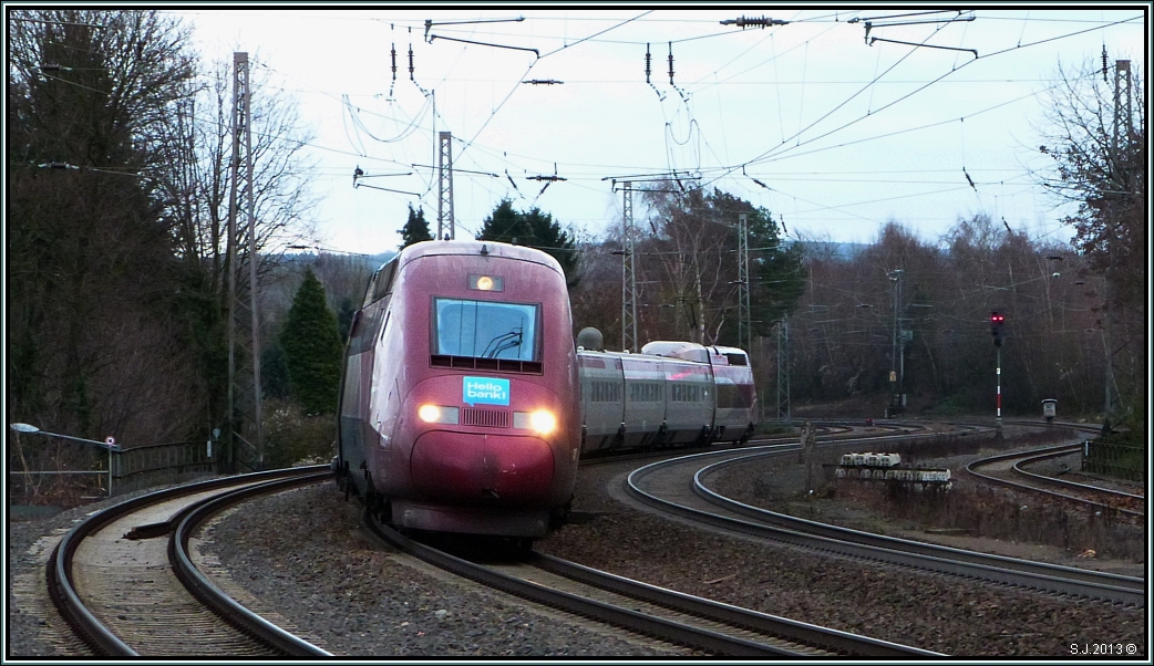 Auf nach Paris.Der Thalys auf der KBS 480 im Gleisbogen bei Eschweiler.Nächster Halt ist Aachen Hbf.Aufnahme vom 23.Dezember 2013. Allen ein ruhiges und besinnliches Weihnachtsfest wünscht. Stefan Jakab