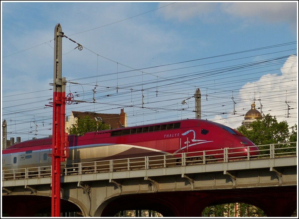 Auf dem Weg von Köln über Aachen und Lüttich nach Paris, ein Thalys am 16.07.2012 auf der Südrampe von Aachen Hbf hoch zum Buschtunnel. Hier wird schon wie in Belgien üblich links gefahren. Beim Halt im Aachener Hbf wird auch schon auf das belgische 3 kV Gleichstromsystem gewechselt. Dazu senkt der Thalys die Stromabnehmer, es wird von 15 kV Wechselstrom auf 3 kV Gleichstrom gewechselt, die Stromabnehmer werden wieder an den Draht gelegt und schon kann es weiter Richtung Belgien gehen. Mario Schürholz