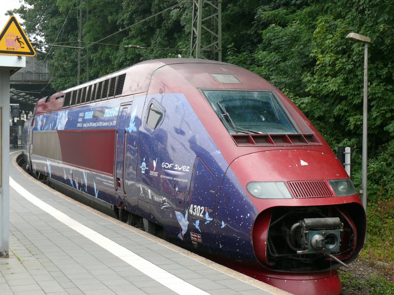 Hier steht der Grund für die Unterbrechung der Verbindung zwischen Deutschland und Belgien an diesem 28. Juni. Dieser Thalys hatte bei der Ausfahrt aus dem Bahnhof Aachen die Oberleitung abgerissen und sich dadurch den Stromabnehmer derart beschädigt, dass an ein Weiterfahren nicht mehr zu denken war. Der Triebzug wurde in den Bahnhof zurückgeschleppt, und für die Reisenden ein Buspendeldienst nach Welkenraedt, dem ersten Bahnhof auf belgischer Seite, eingerichtet. Schade, dass man im Bhf Aachen nicht in der Lage war, auch die ausländischen Fahrgäste, die in einem internationalen Zug in Richtung Belgien und Frankreich doch zahlreich sind und der deutschen Sprache nicht mächtig, angemessen zu informieren. Die Lautsprecherdurchsagen waren ausschliesslich in Deutsch. Ich selber habe ein Dutzend französischsprachiger Fahrgäste, die ratlos auf dem Bahnsteig standen, über die Situation informiert und zum Buspendelplatz gebracht. Dieter Schumacher
