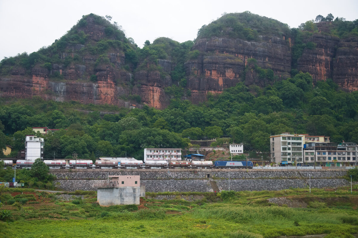 2025.09.20, HXD1C 6086 der CR GuangZhou (ZhuZhou Depot), nördlich des Bahnhofs PingShi. Der 6086 mit seinem Zug aus Kraftstofftankwagen überquert das Zentrum der kleinen Grenzstadt hoch oben am Flussufer unterhalb des interessant geformten JingJiLing, was „Goldener Hühnergrat” bedeutet, obwohl mein Objektiv nicht weitwinklig genug ist, um den gesamten Grat in einem Bild einzufangen... KCRC Railway