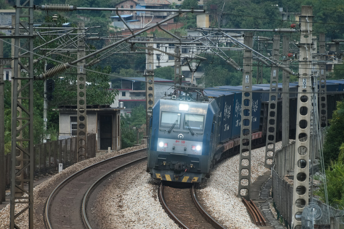 2025.09.21, HXD1C 0943 der CR GuangZhou (ZhuZhou Depot), südlich des Bahnhofs BaiShiDu in der Provinz HuNan. Dieser Zug bestand ausschließlich aus blauen Intermodalcontainern der „China Railway“ anstelle von bunten Containern mit verschiedenen Markenlogos. KCRC Railway