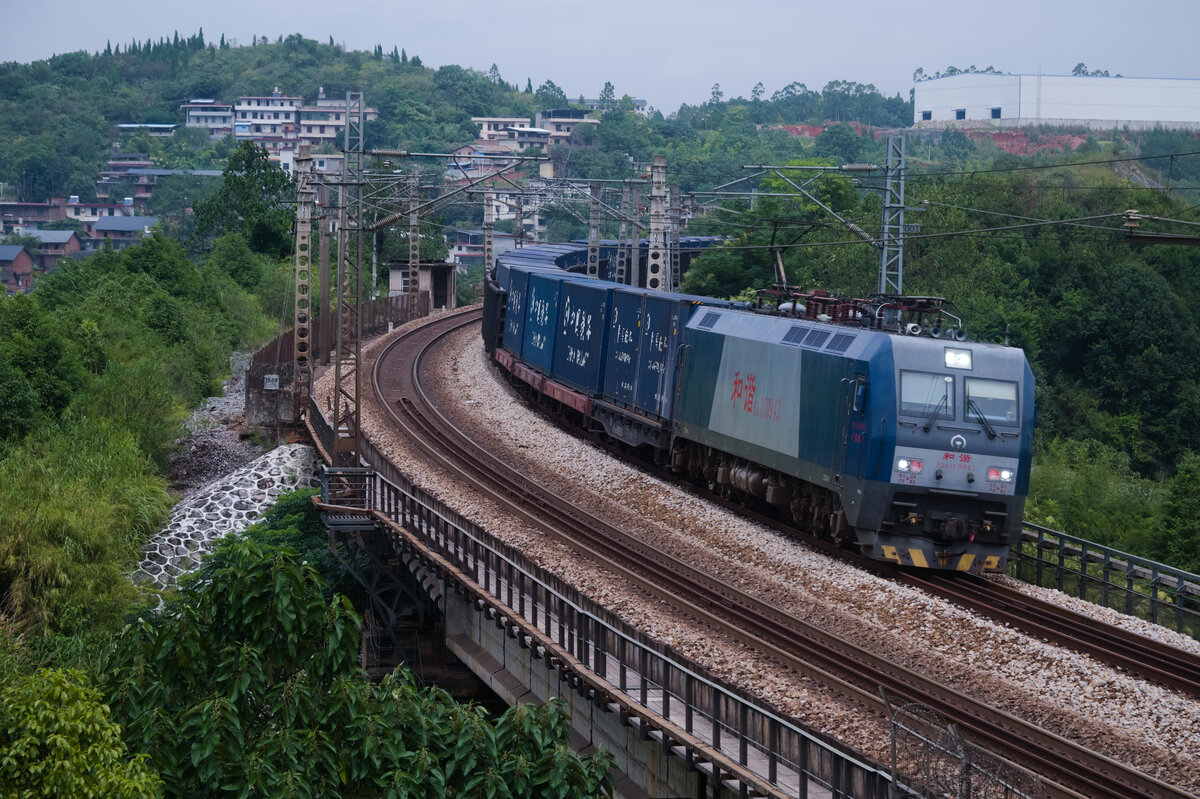 2025.09.21, HXD3C 0535 der CR GuangZhou (Depot ChangSha) bewältigt die Kurve auf der Brücke über dem alten Gleisbett der Strecke Peking-Guangzhou. Die CR hält weiterhin an der Tradition fest, den Personenverkehr über extrem lange Strecken mit geringerer Geschwindigkeit (120 km/h vmax) zu betreiben, was es ihr ermöglicht, Güterlokomotiven wie die HXD3C mit niedrigerer vmax für diesen Dienst einzusetzen. KCRC Railway