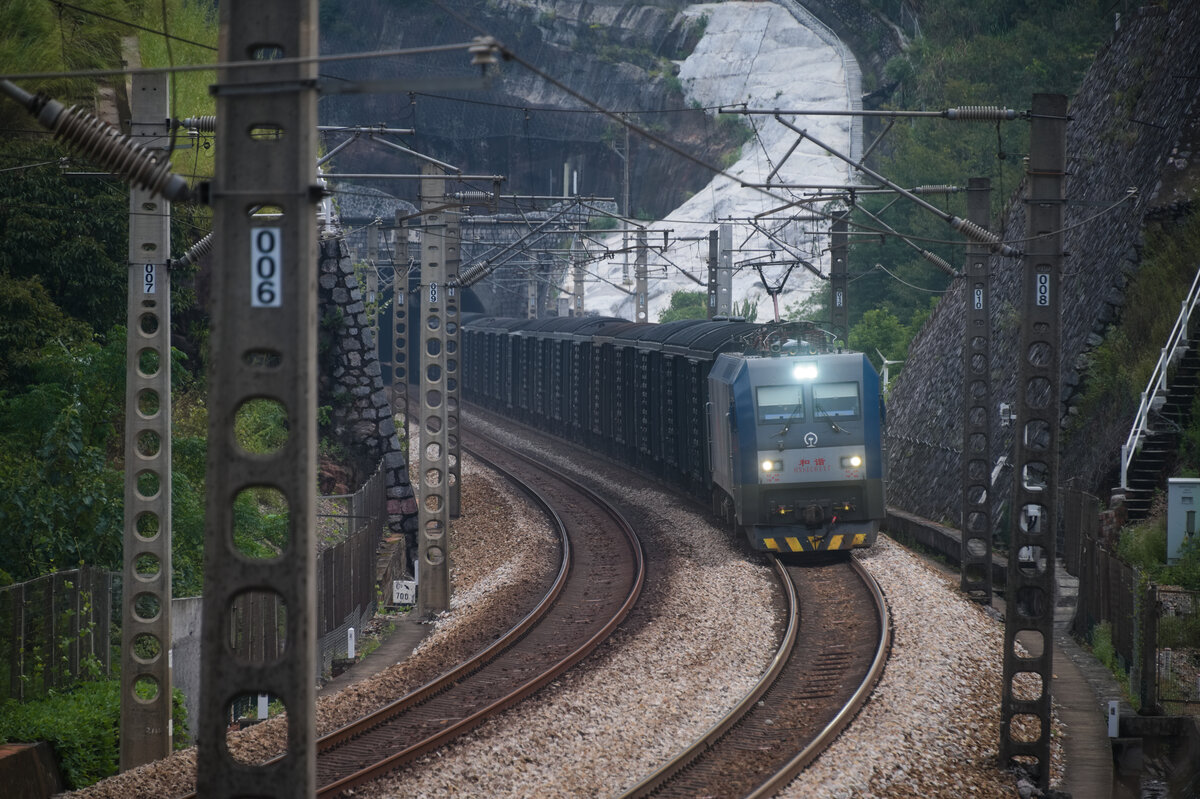 2025.09.20, HXD1C 6034 of CR GuangZhou (ZhuZhou Depot), south of BaiShiDu Station at HuNan Province. 6034 hauling a bunch of open wagon southward, getting ready to enter tunnel, where headlight of HXD1D 0379 of CR GuangZhou (GuangZhou Depot) with its passenger train shine at the corner in tunnel.
