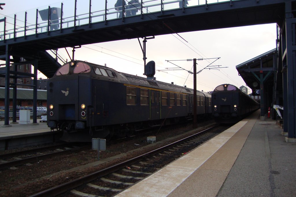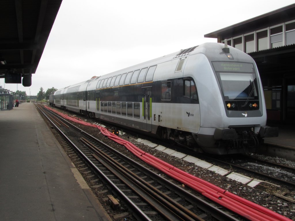 DSB-Bahnhof Nykøbing Falster, Gleis 3: Am Nachmittag des 10. Oktober 2020 ist ein Regionalzug nach Næstved abfahrbereit. Der Zug besteht aus der dieselelektrischen Lok ME 1535, zwei Doppelstockpersonenwagen des Typs B, einem Doppelstockpersonenwagen des Typs Bk und einem Doppelstocksteuerwagen (ABs). - Die ME 1535 wurde 1985 von der Firma Henschel hergestellt, während die Firma Bombardier in Görlitz die Personen- und Steuerwagen ab 2002 baute. Kurt Rasmussen