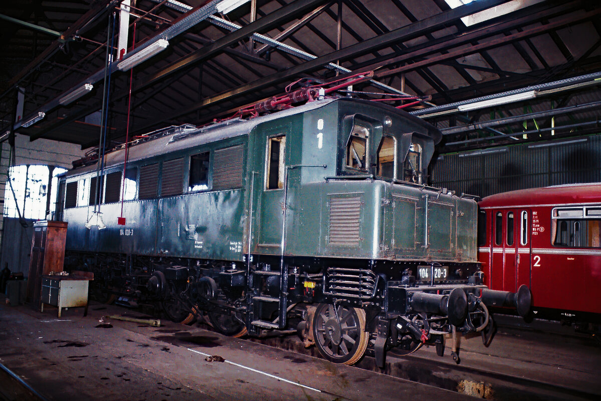 In der normnalerweise nicht zugänglichen und leider fast unbeleuchteten Halle des Bw. München-Neuaubing hatte die DB zahlreiche, spätere Museumsloks abgestellt. Dort entstand am 28.10.1983 bei einer privaten Besichtigungsmöglichkeit die Aufnahme der anschließend in Frankfurt und danach im DB-Museum Koblenz-Lützel aufgestellten 104 020. Ernst Lauer