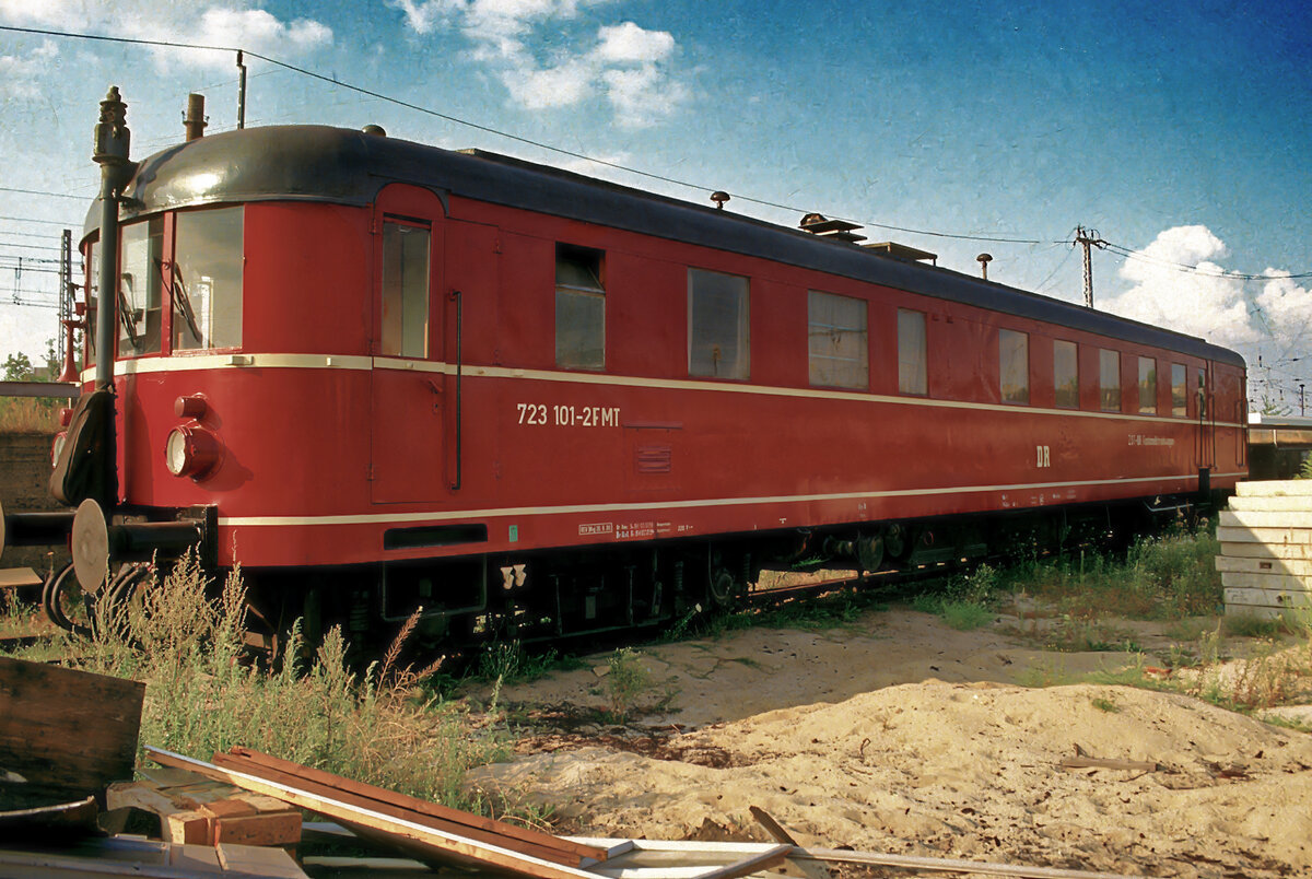 ZST Funkmesstriebwagen mit der DB-Nummer 723 101, aber noch mit  DR  beschriftet, am 02.06.1997 im Bw. Berlin-Lichtenberg.