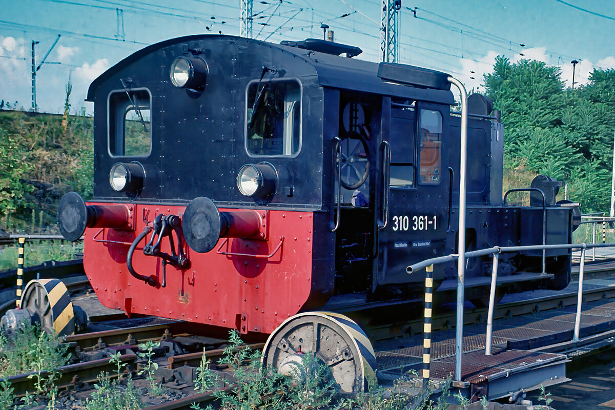 Die Kleinlok der Lg. II 310 361 am 06.08.1994 im Bw. Berlin-Lichtenberg. Die Lok wurde von O&K 1934 an die DRG geliefert und erhielt zunächst die Tfz.-Nummer Kö 4361. Bei der DR bekam sie die Nummer 100 361 und abschließend bei der DB die angeschriebene Nummer 310 361. 1995 wurde die Lok ausgemustert.