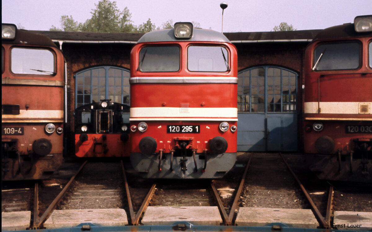 Wenn man beim Bahnpersonal oder in der Lokleitung freundlich fragte und sich als "Eisenbahnfotograf" zu erkennen gab, dann hatte ich kurz nach der Wende in den ehemaligen DR-Betriebswerken immer die Gelegenheit, mich unter Beachtung aller Sicherheitsvorschriften auf dem Gelände umzuschauen. So entstand am 19.09.1991 auch die Aufnahme der DR 120 030 vor dem Lokschuppen im Bw. Leipzig-Wahren. Ernst Lauer