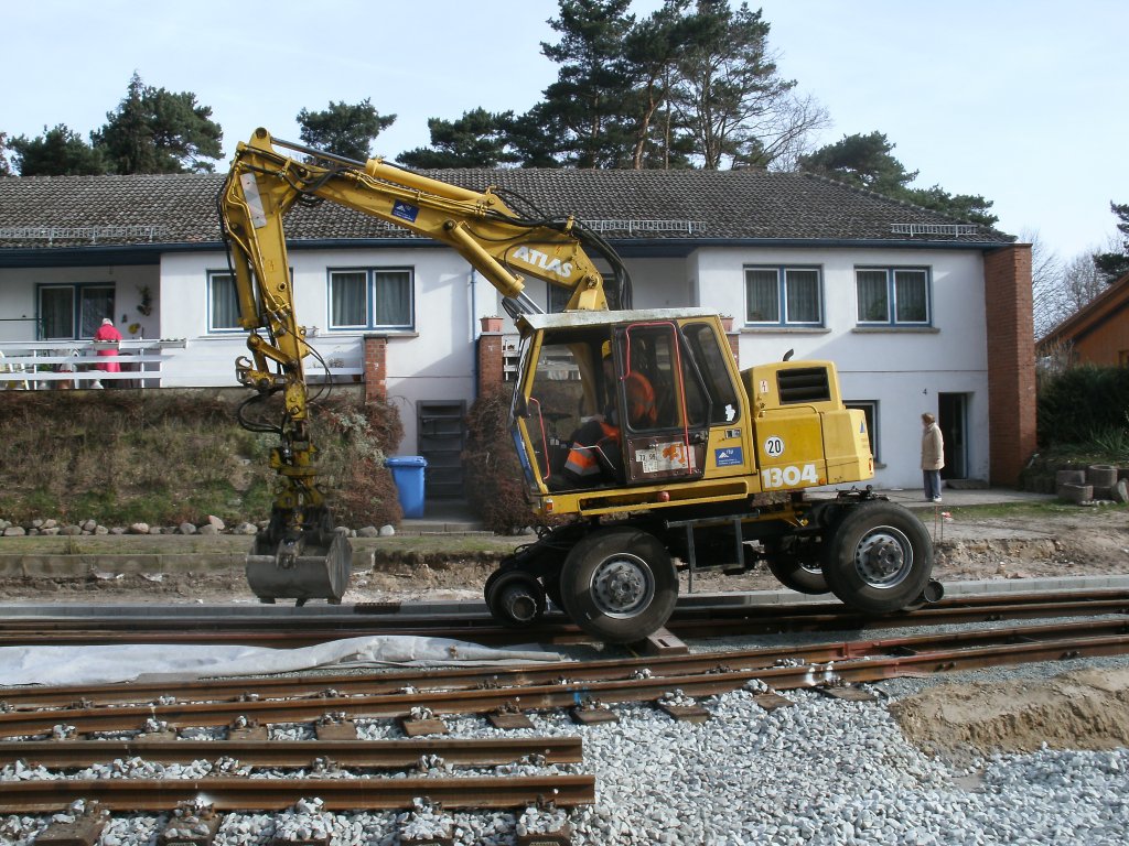 Mit Hilfe eines Zweiwegebaggers werden zwischen Göhren und Philippshagen die alten Gleise entfernt,neben dem Auswechseln des alten Gleises wird auch das alte Kiesbett gegen ein neues Schotterbett ausgetauscht.Vor Göhren war am 05.November 2010 dieser Zweiwegebagger unterwegs. Mirko Schmidt
