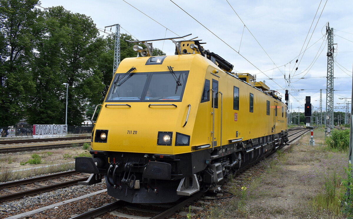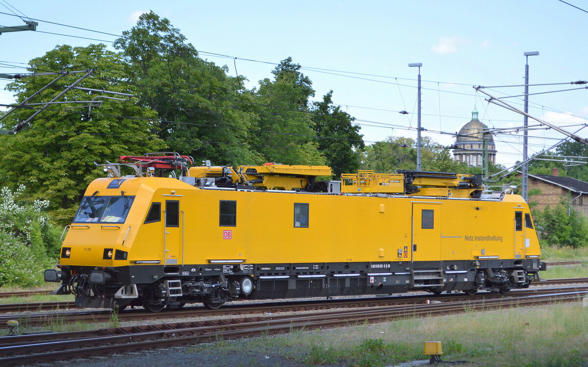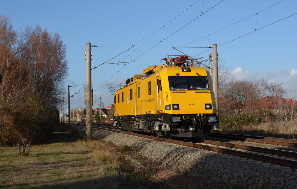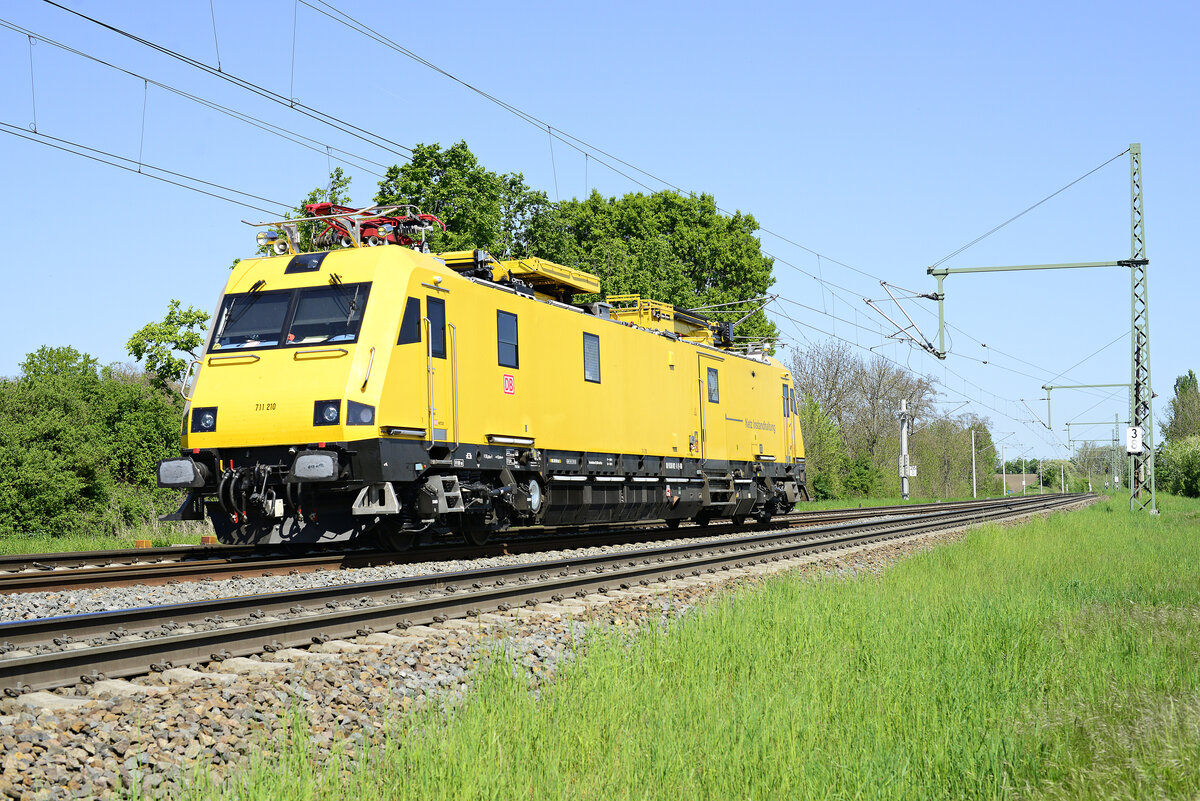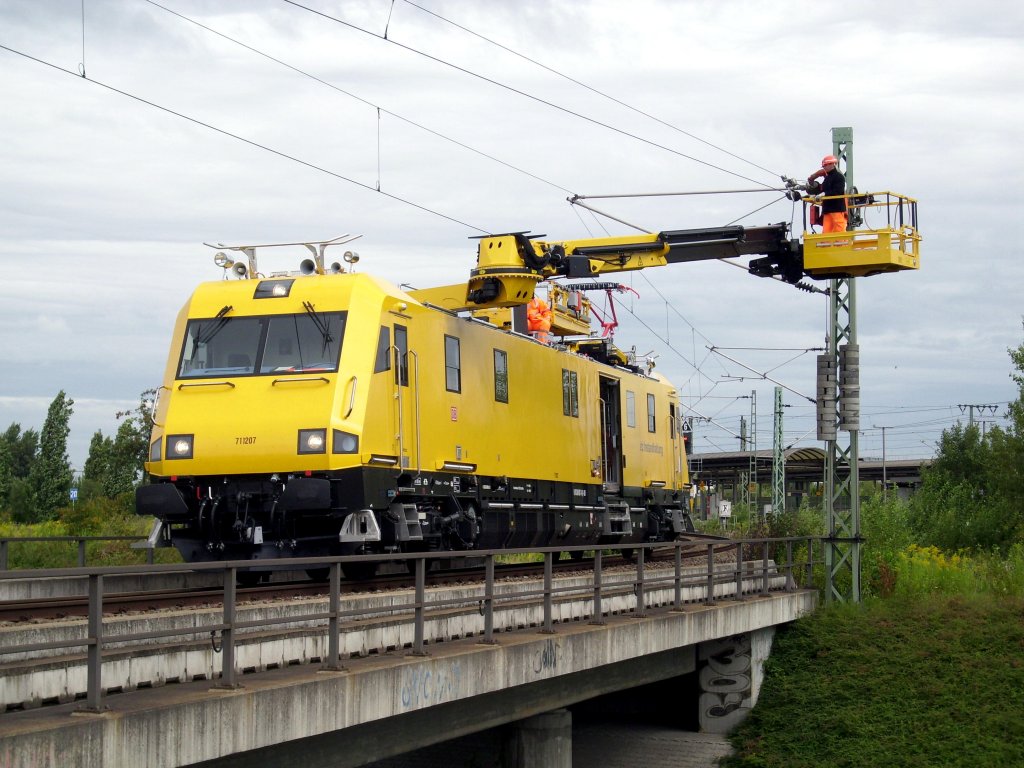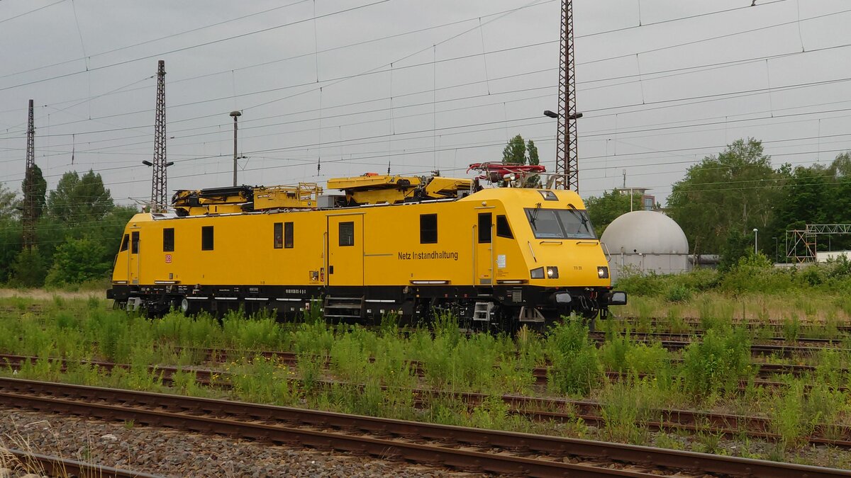 Hier passiert 711 210 (Robel 57.44 | 99 80 9136 012-8 D-DB), ein Instandhaltungsfahrzeug für Oberleitungsanlagen, die Zugbildungsanlage (ZBA) Halle (Saale) in nördlicher Richtung. Dieses ist eines von vier Fahrzeugen, das für die Wartung der ICE-Trasse Berlin–Nürnberg mit ETCS ausgestattet wurde.