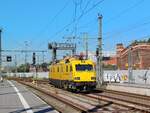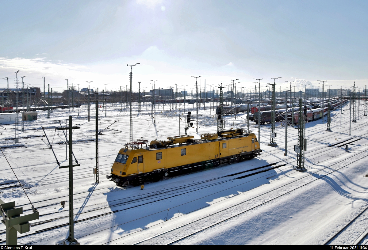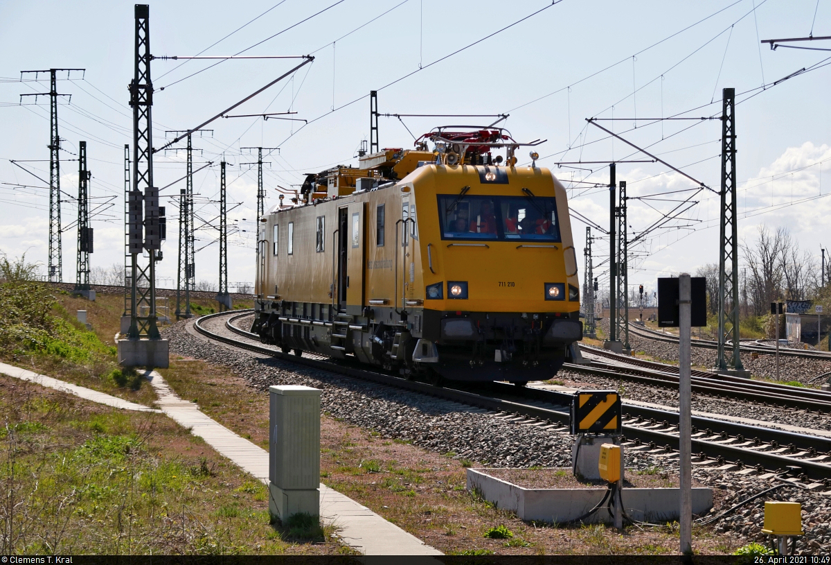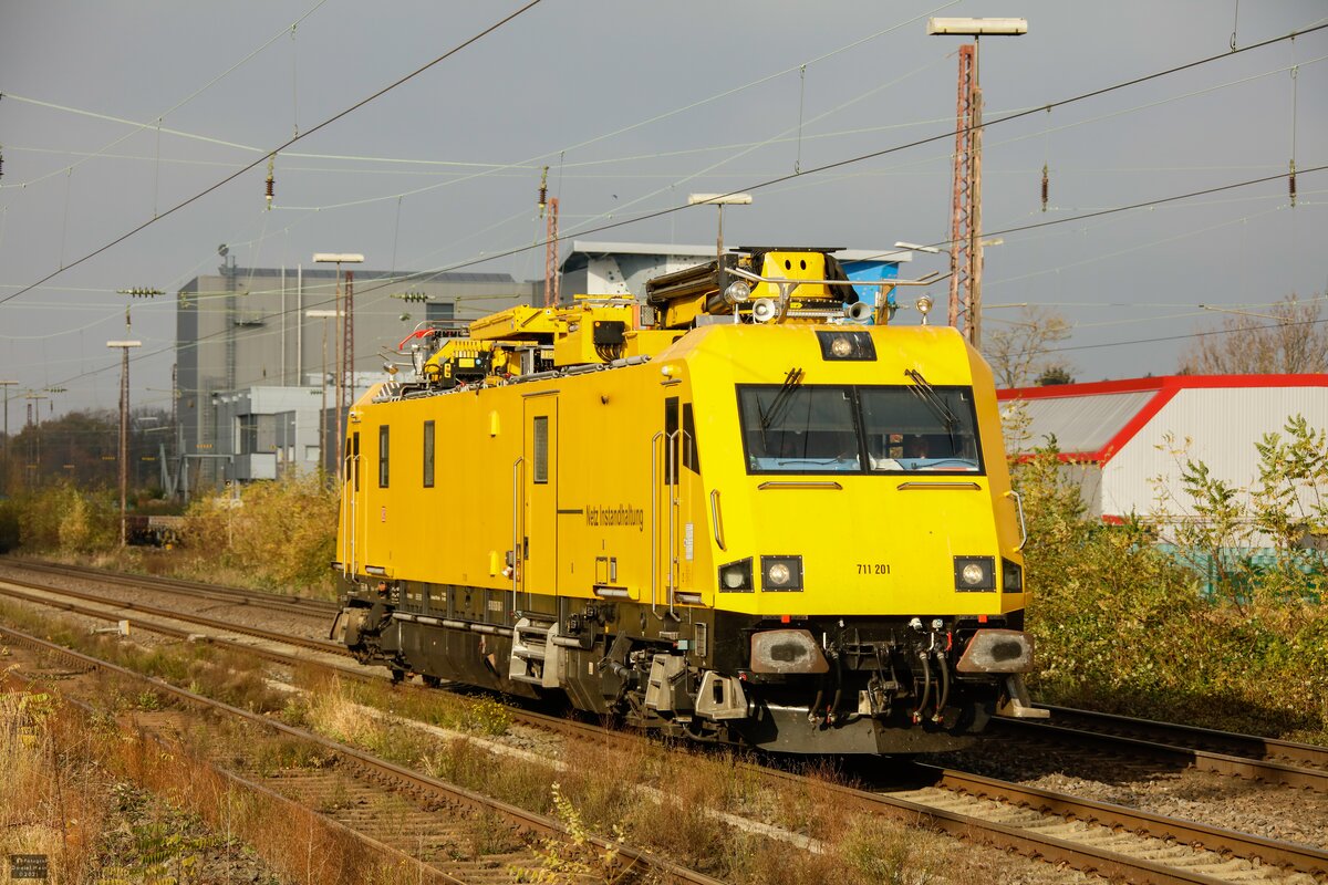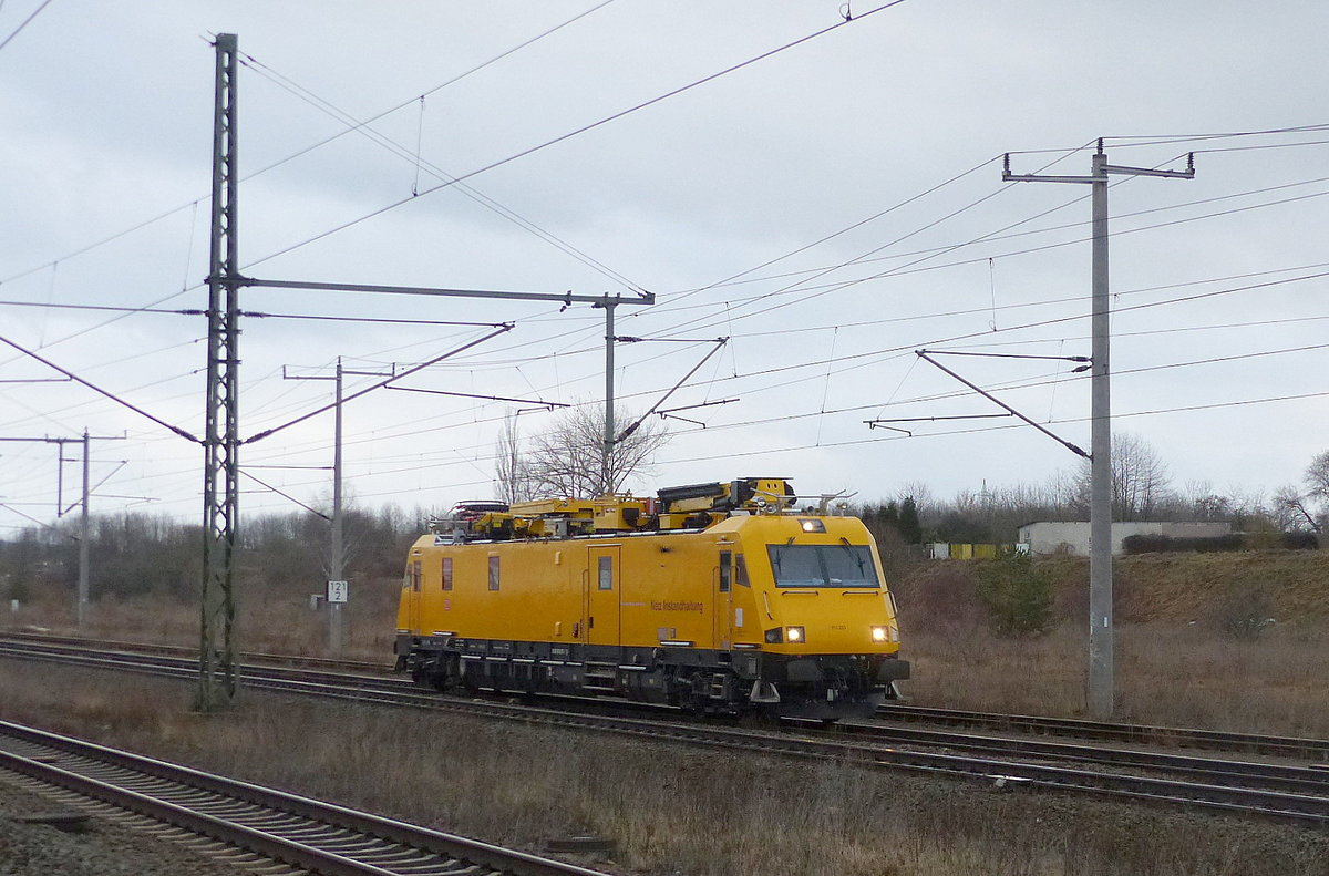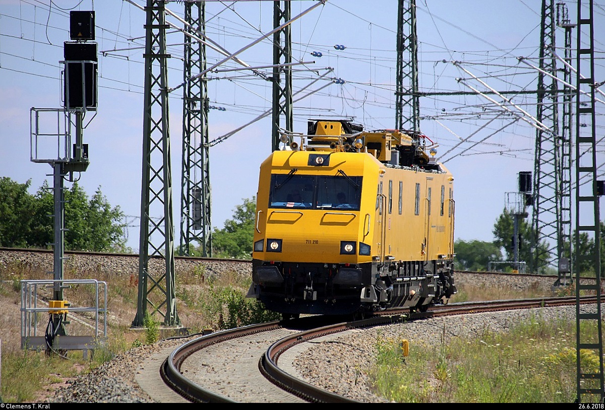 Hier passiert 711 210 (Robel 57.44 | 99 80 9136 012-8 D-DB), ein Instandhaltungsfahrzeug für Oberleitungsanlagen, die Zugbildungsanlage (ZBA) Halle (Saale) in nördlicher Richtung. Dieses ist eines von vier Fahrzeugen, das für die Wartung der ICE-Trasse Berlin–Nürnberg mit ETCS ausgestattet wurde.