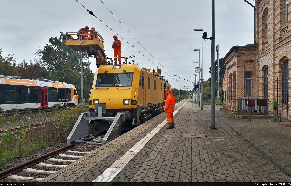 Oberleitungsarbeiten auf dem einzigen elektrifizierten Gleis im Bahnhof Halle-Trotha – mit dem Instandhaltungsfahrzeug für Oberleitungsanlagen 711 213 (Robel 57.44 | 99 80 9136 015-1 D-DB).