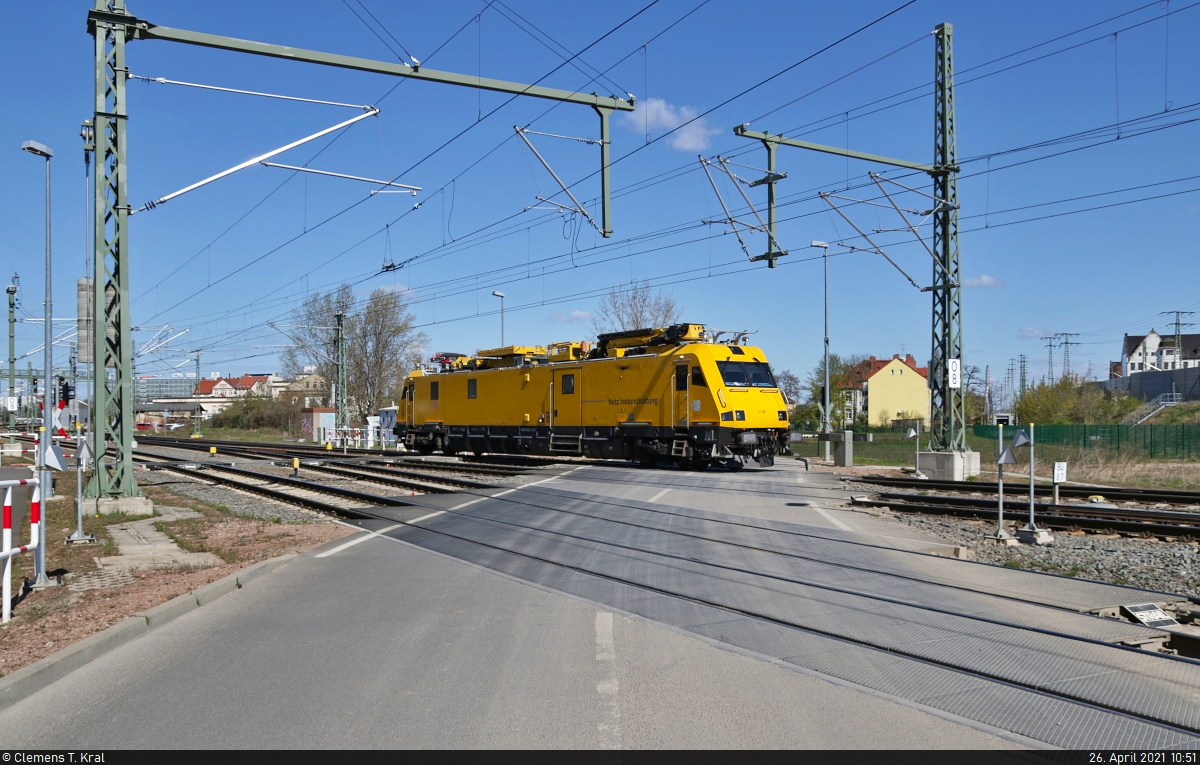 Nachschuss auf Instandhaltungsfahrzeug für Oberleitungsanlagen 711 210 (Robel 57.44 | 99 80 9136 012-8 D-DB) am Bahnübergang Karl-von-Thielen-Straße auf den Gütergleisen in Halle (Saale). Es ging zurück in die Abstellung bei Halle(Saale)Hbf.
