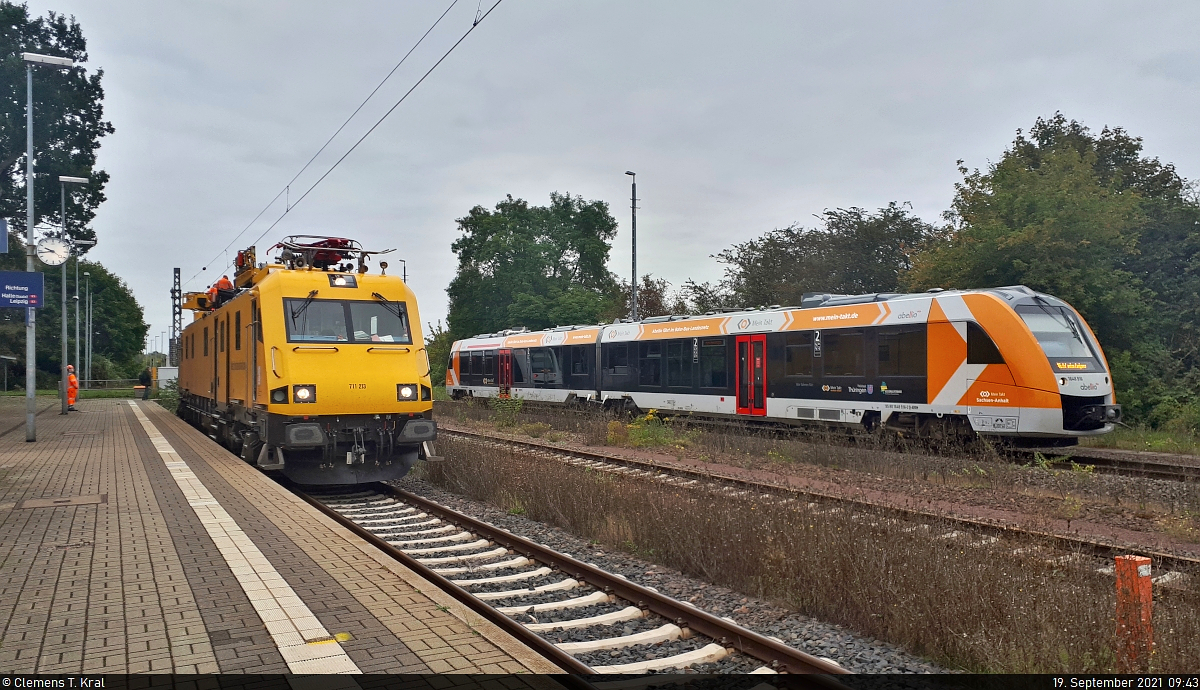 Wegen Bauarbeiten zwischen Halle(Saale)Hbf und Halle-Trotha gab es Mitte September Schienenersatzverkehr. So rückte das Instandhaltungsfahrzeug für Oberleitungsanlagen 711 213 (Robel 57.44 | 99 80 9136 015-1 D-DB) zum Trothaer S-Bahn-Gleis aus, während daneben der für die NASA werbende 1648 916-2 (Alstom Coradia LINT 41) mit dem Anzeiger "Nicht einsteigen" auf seinen nächsten Einsatz wartet.
