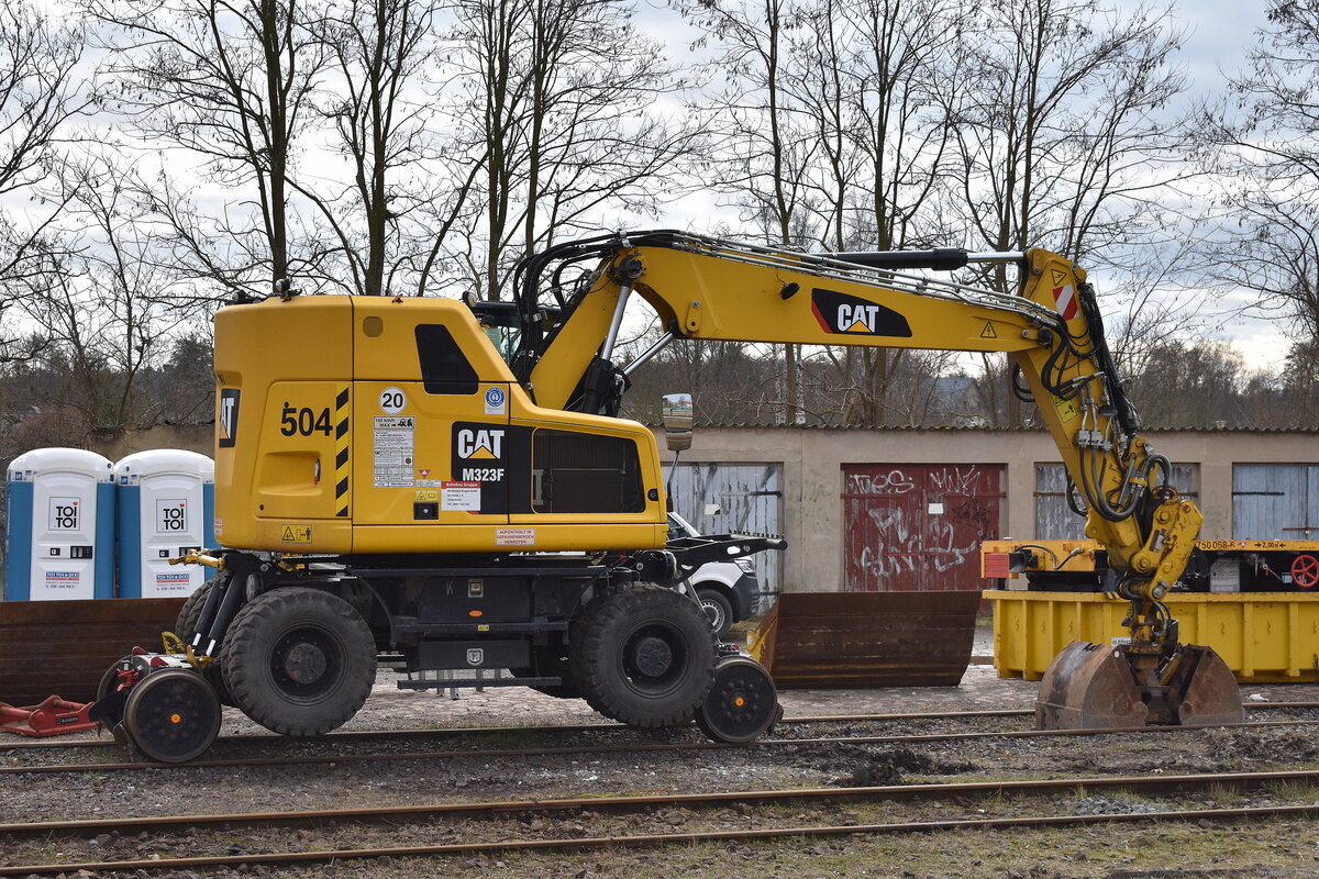 Die Zweiwegebagger D-JH 99 80 9903 634-0 (Liebherr A 922 Rail Litronic) und D-VELOG 9980 9902 531-4 (Catapillar M323F) der Joseph Hubert GmbH, am 25.06.2024 im Baugleis in Veitshöchheim. Frank Thomas
