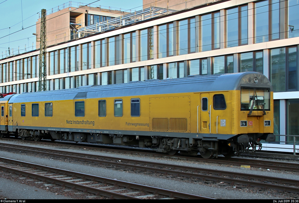 Blick auf einen Messwagen (99 80-93 60 001-8 D-DB) der DB Netz AG, der in einem Messzug mit 120 160-7 der DB Netz AG eingereiht und in Karlsruhe Hbf auf Gleis 472 abgestellt ist. Der Zug absolvierte an diesem Tag Messfahrten. Zunächst von Mannheim Hbf nach Kraichtal, dann nach Bad Schönborn, von dort aus weiter bis Basel Bad Bf und schließlich am späten Nachmittag zurück nach Karlsruhe Hbf. Aufgenommen von Bahnsteig 13/14. [24.7.2019 | 20:29 Uhr]