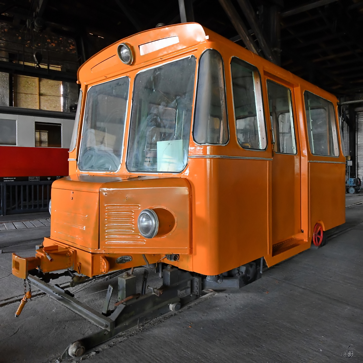 Der restaurierte historische DRG Meßwagen für Schwingungsuntersuchungen Lokmotivversuchsabteilung Grunewald, (Berlin) Bln 700 587, vom berühmten Lokomotiv- Versuchsamtes (LVA) in Berlin Grunewald, am 26 Mai 2024 beim Lokschuppen Hochdahl vom Eisenbahn- und Heimatmuseum Erkrath-Hochdahl e.V.. Bei dem Wagen handelt es sich um einen 1928 von der Sächsischen Waggonfabrik Werdau gebauten Wagen, der von der Lokomotivversuchsabteilung Grunewald für lokomotivtechnische Untersuchungen genutzt wurde. Die Arbeiten wurden im Rahmen des Förderprogramms „Verkehrshistorische Kulturgüter“ durch die NRW-Landesregierung gefördert. Ursprünglich war der Wagen 1928 von der Sächsischen Waggonfabrik Werdau (die im gleichen Jahr mit Linke-Hofmann-Busch fusionierte) als Packwagen Pw4ü-28 Ost 90203, ein genieteter Einheitsschnellzugwagen (Ganzstahlwagen der Bauart 28), für die DRG gebaut worden. Aber bereits 1930 wurde er zum Meßwagen für Lauf- und Schwingungsforschung 105 136 Ost, für das Lokomotiv-Versuchsamt Grunewald (LVA) umgebaut. Nach dem 2. Weltkrieg wurde das LVA in der Bundesrepublik Deutschland zunächst in Göttingen als Bundesbahn-Zentralamt (BZA), später in Minden sowie in München fortgesetzt. Der Meßwagen (der Gattung Dienst4ü) wurde 1934 zum DRB Bln 700587 (Berlin 700 587) umgezeichnet. Dieser Wagen verblieb nach dem Krieg im Westen und wurde so zum Meßwagen DB Han 729 031 der Deutschen Bundesbahn beim BZA Göttingen. Ab 1952 dann DB Han 5044 der Gattung Meßwagen 318 vom BZA Minden (Westf.), später 51 80 99-60 010-9 D-DB. Weitere Nummer, Bezeichnungen und Gattungen waren: Köl 5406 Unterrichtswagen 338 bzw. Eignungstestwagen 348 60 80 99-69 901-9 D-DB Unterrichtswagen 338 beim Bww Köln-Deutzerfeld So hatte der fast 100jährige Wagen ein bewegtes vielfältiges Leben, aktuell befindet er sich im Besitz nun vom Eisenbahn- und Heimatmuseum Erkrath-Hochdahl. Von Messeinrichtung ist im Wagen nichts mehr zu sehen, nur im Fußboden verlaufen noch viele Kabel. TECHNISCHE DATEN (laut Anschriften): Spurweite: 1.435 mm (Normalspur) Achsanzahl: 4 (in 2 Drehgestellen) Länge über Puffer: 19.680 mm Drehzapfenabstand: 12.360 mm Achsabstand im Drehgestell: 3.600 mm Drehgestell Bauart: Drehgestelle Bauart Görlitz II Eigengewicht: 39.200 kg Max. Zuladung: 9.500 kg Tragfähigkeit: 10.000 kg Die Drehgestelle der Bauart Görlitz II wurden 1925 von der damaligen Waggon- und Maschinenbau AG (WUMAG) in Görlitz ursprünglich für die Wagen des FD Rheingold entwickelt, um den Reisenden besondere Laufruhe zu bieten. Sie wurden später auch für die Schnellzugwagen der Bauart 28 verwendet. Der Achsstand beträgt wie beim Vorgänger (Görlitz I) 3.600 mm. Die Drehgestelle verfügen über Wiegen, die auf in Längsrichtung angeordneten Blattfedern gelagert sind, zudem verfügt die Bauart Görlitz II über eine zusätzliche Federung. Anfangs wurden Torsionsfedern, später (wie hier) Schraubenfedern verwendet.