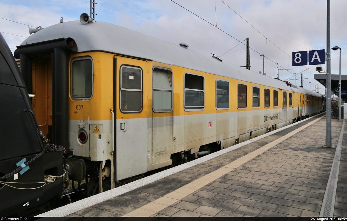 Einheitsmesswagen mit der Bezeichnung "Dienstüm 313" (63 80 99-92 007-3 D-DB), eingereiht in einem Testzug in Magdeburg Hbf auf Gleis 8. 🧰 DB Systemtechnik GmbH 🕓 26.8.2021 | 8:59 Uhr