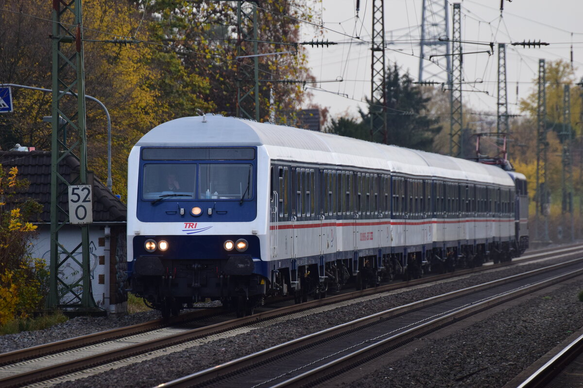 Steuerwagen vorraus schiebt 110 469 ihren RE1 Verstärker durch Angermund gen Duisburg. Angermund 26.11.2022