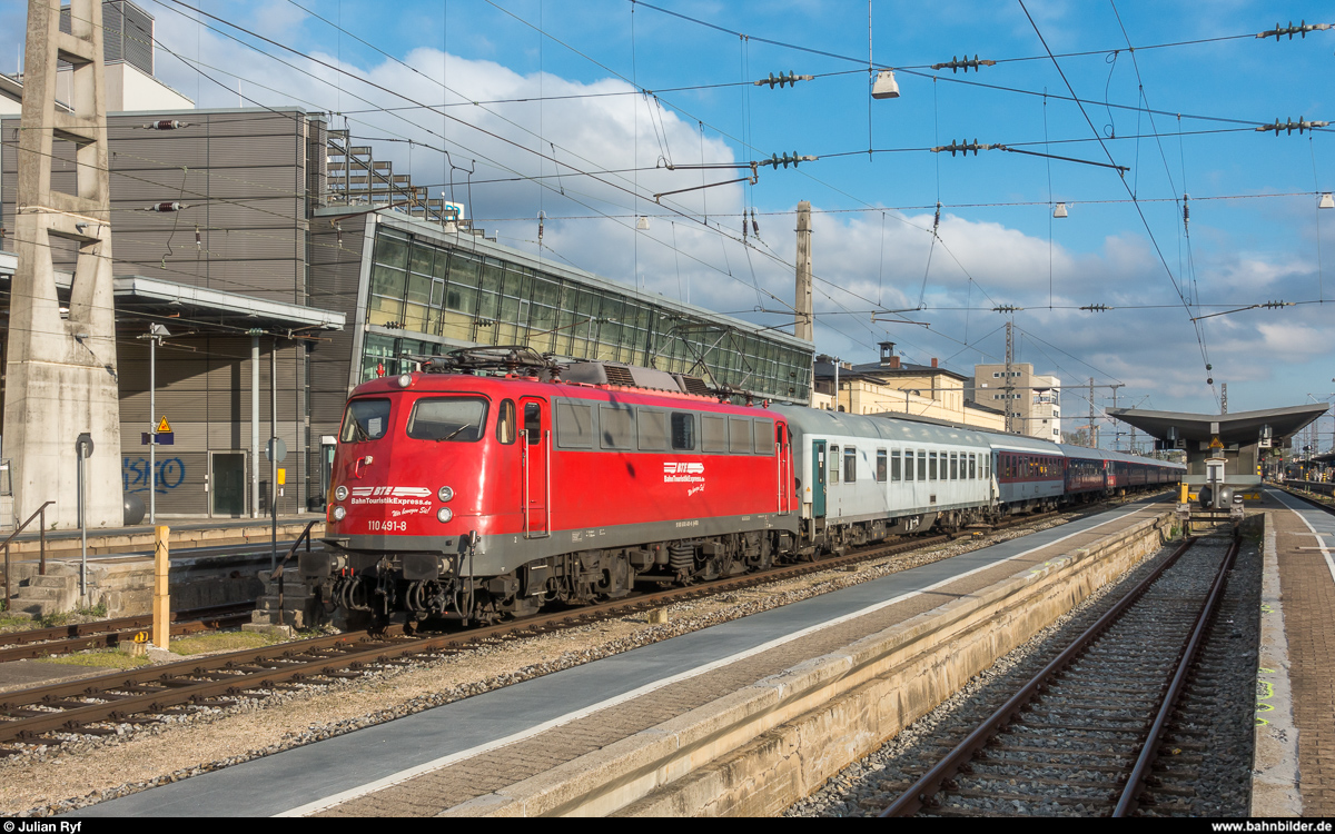 Zufallstreffer beim Umsteigen in Augsburg am Abend des 13. April 2018. Auf Gleis 3 wartet die Bügelfalte 110 491 von BTE mit einem Sonderzug nach Heidelberg. Julian Ryf