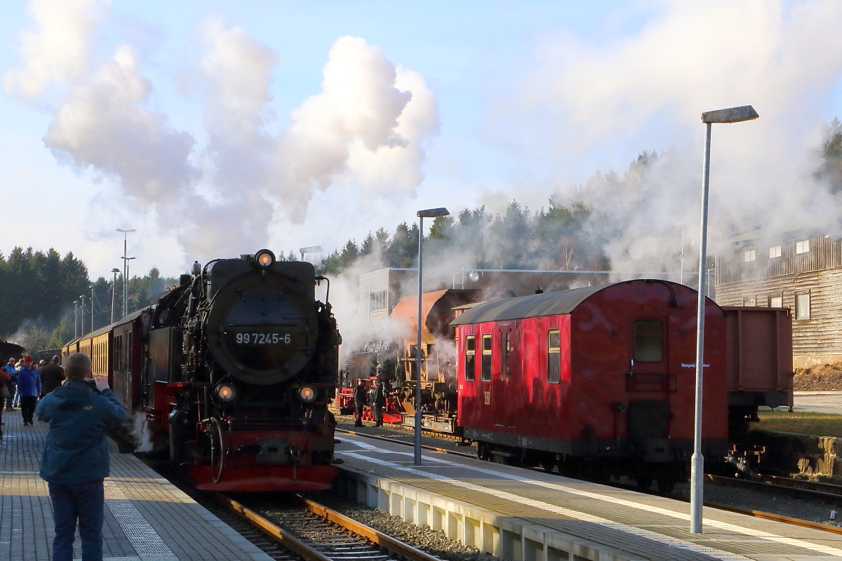 Upps!! Da hat der Heizer von 99 7245 (hier am 06.02.2016 mit P8903 nach Eisfelder Talmühle bei der Einfahrt in den Bahnhof Benneckenstein) es mit der Brennstoffzufuhr wohl ein klein wenig zu gut gemeint. Mit explosionsartigem Zischen kommt es bei der Einfahrt immer wieder zum Ansprechen der Kessel-Sicherheitsventile! Daneben steht der Begleitwagen des HSB-Fotogüterzuges, welcher zuvor von 99 222 hierher versetzt wurde, dahinter dann genannte Dampflok, gerade dabei den Rest des Zuges ebenfalls auf das Nachbargleis zu rangieren. Die Aufnahme entstand während einer Sonderzugveranstaltung der IG HSB. Michael Edelmann