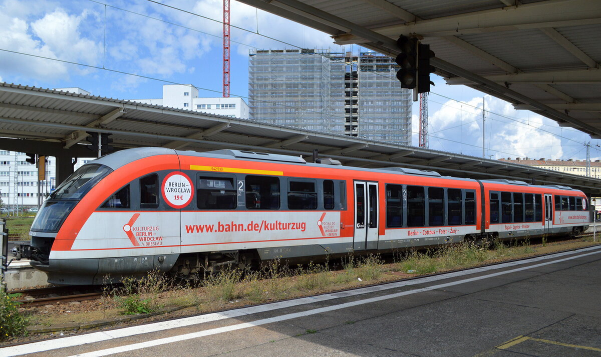 Einer von den zwei in Berlin Lichtenberg stationierten DB Desiro Triebzügen mit der Aufschrift "kulturzug" für die Strecke Berlin - Wroclow - Breslau in Polen, der Triebzug "642 539" (95 80 0 642 539-0 D-DB ....) am 06.08.21 Bf. Berlin Lichtenberg. Lothar Stöckmann