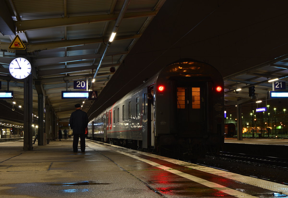 Ganz ruhig wartet der Zugchef auf die Abfahrt seines EN 23J/452 in Berlin Lichtenberg. Im Monent der Aufnahme wurde noch die Lok umgespannt.