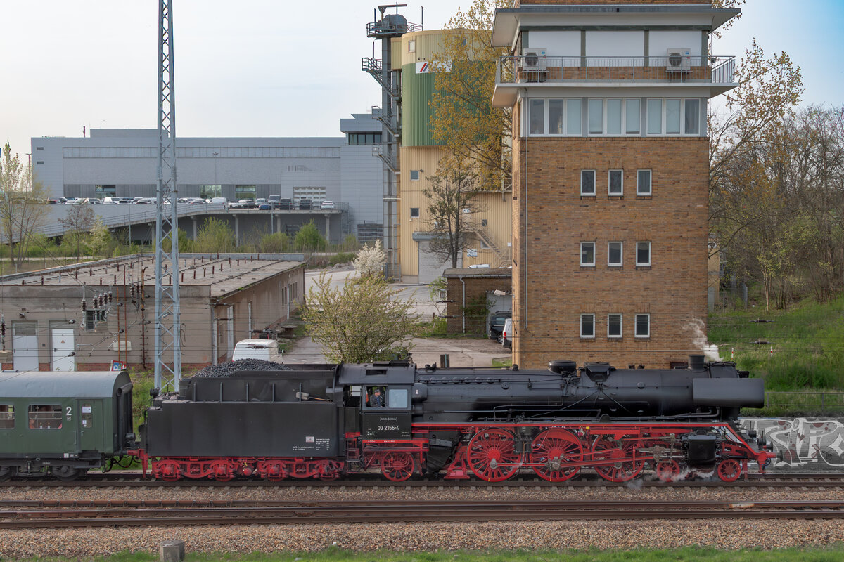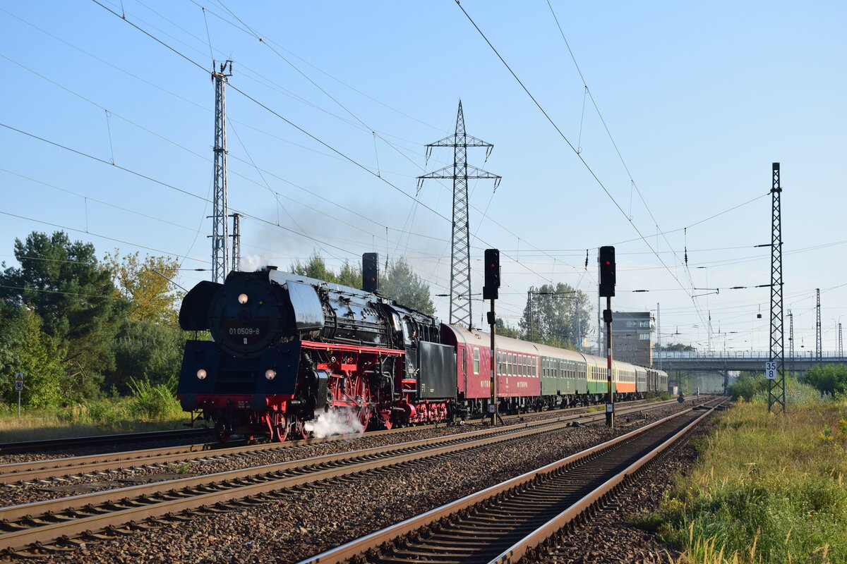Unerhofft kommt oft. Da mein Zug am Morgen ausfiel und der Anschluss nach Müncheberg somit auch hinfällig war entschied ich mich die Stunde in Schönefeld zu bleiben und dort etwas zu fotografieren. So kam 01 0509-8 mit einem leeren Wagenpark durch Berlin Schönefeld Richtung Westen gefahren.