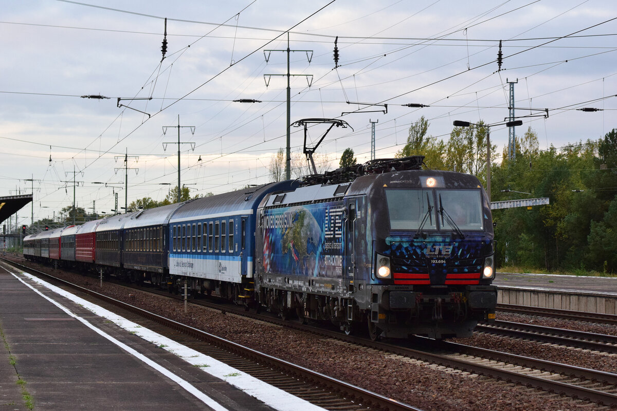 193 694 fährt mit einem Sonderzug aus Bratislava durch Berlin Schönefeld. Ziel des Zuges ist Berlin Charlottenburg. Anlass des Sonderzuges war die Innotrans 2024.