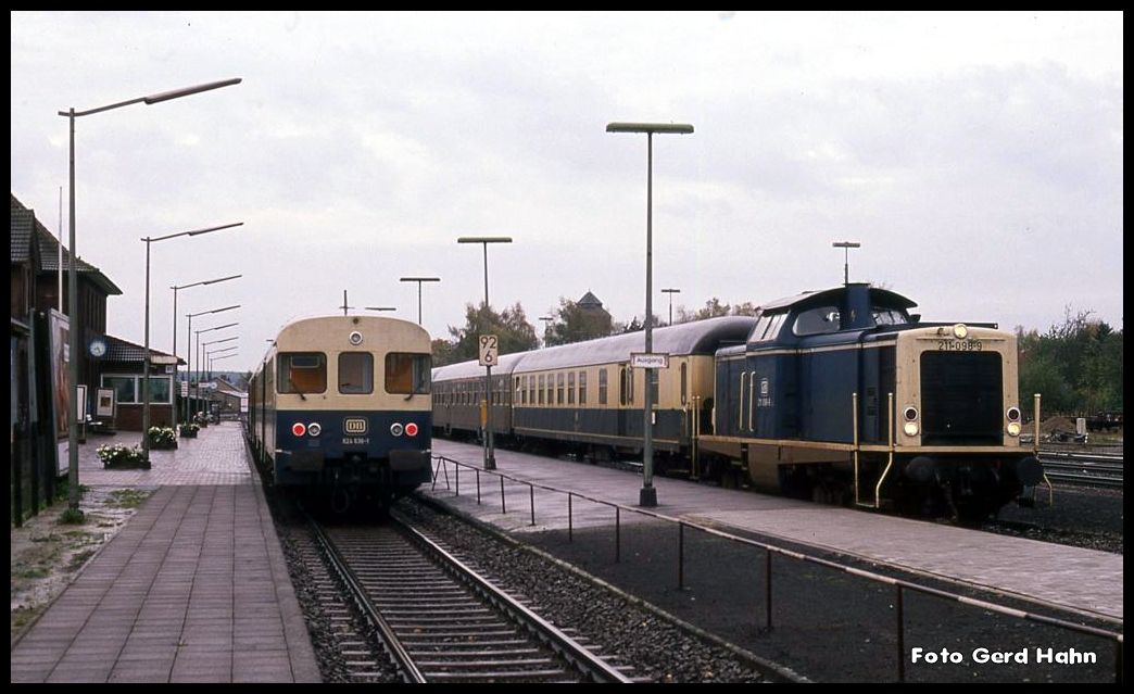 Zugkreuzung im Bahnhof Bramsche am 21.10.1989. Damals waren dort noch die DB Fahrzeuge der Reihen 624 / 634, 211 und 216 der tägliche Anblick und Standard. Um 8.26 Uhr war ein solcher VT in Richtung Osnabrück unterwegs. Auf dem zweiten Gleis steht abfahrbereit 211098 mit dem 8308 nach Delmenhorst. Heute wird der Zugverkehr im Personenzugbereich ausschließlich mit Triebwagen der Nordwestbahn abgewickelt. Gerd Hahn