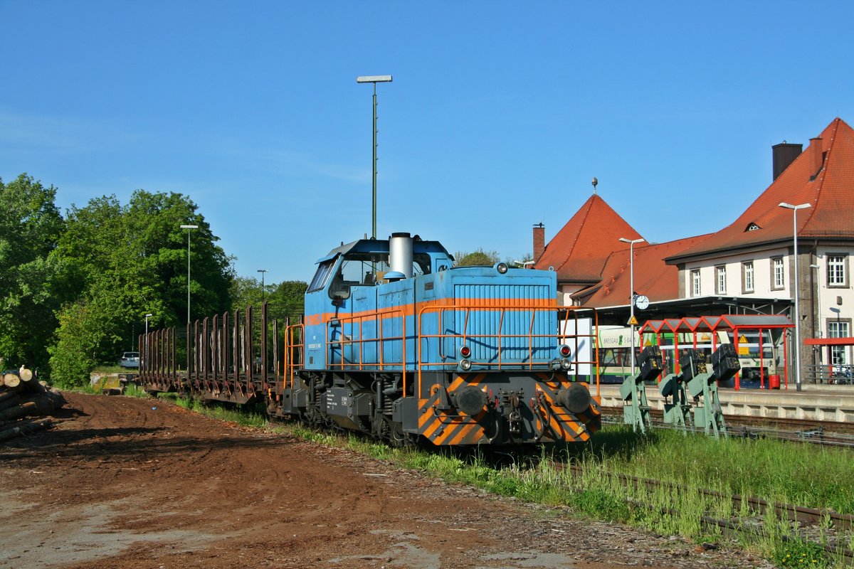 Die Gmeinder-Lok V 102 hat im Bahnhof Breisach zwei leere Holzwagen an der Ladestraße bereitgestellt. Aufgenommen am 06.05.2016.