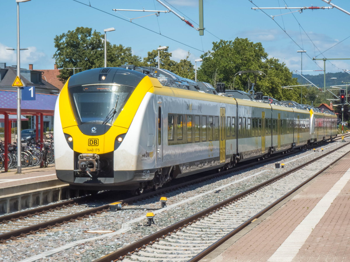 1440 172 (rechts, als S1 eintreffend) und 1440 179 (links, als S1 ausfahrend) treffen sich im Bhf. Breisach.