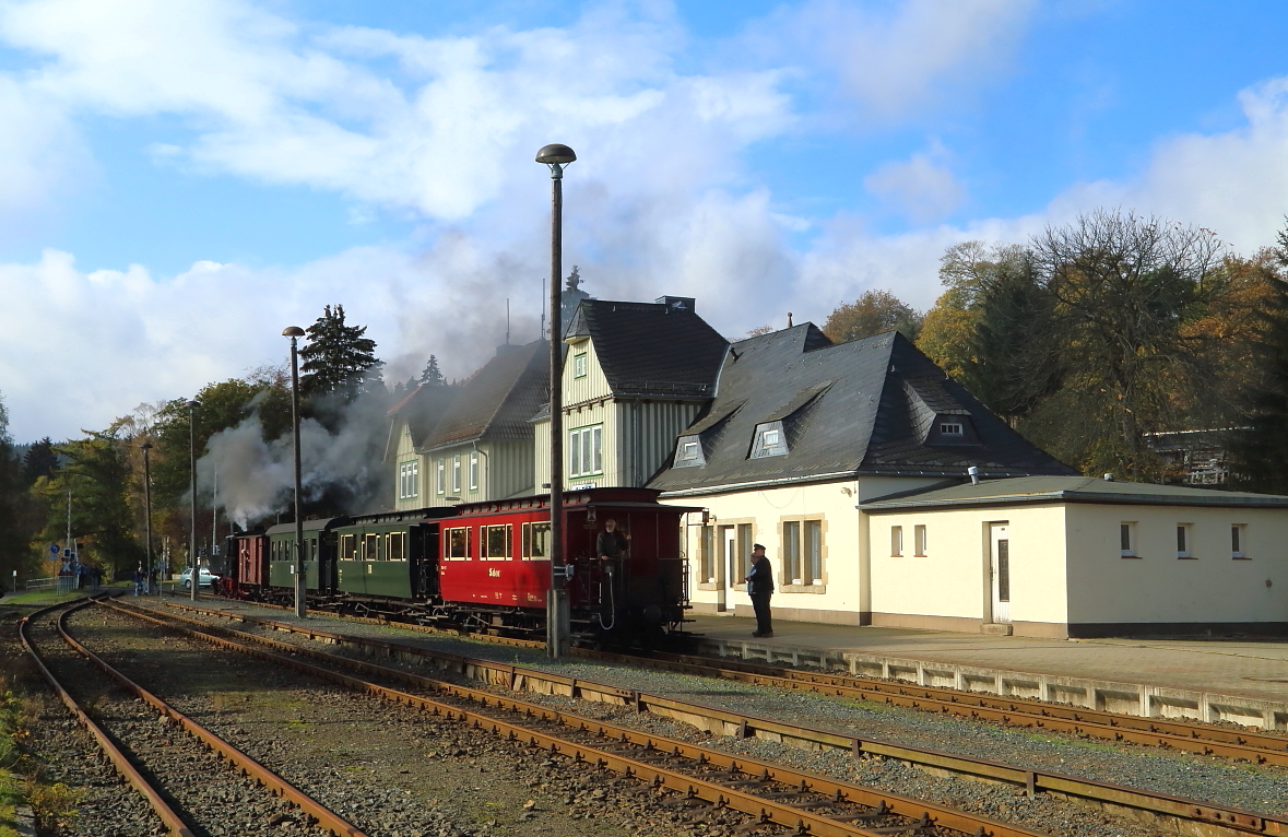 17.10.2015 vormittags. Soeben ist 99 5901, mit ihrem IG HSB-Sonderzug auf dem Weg von Wernigerode nach Nordhausen Nord, in den Bahnhof Elend eingefahren. Michael Edelmann