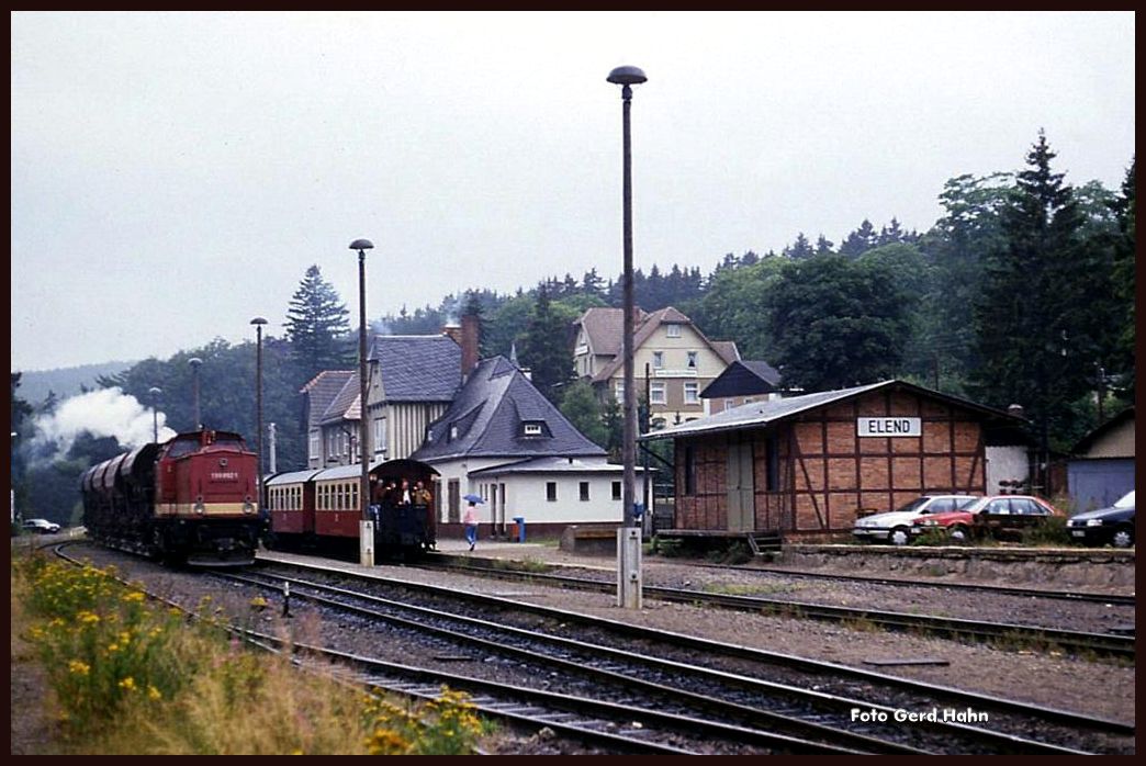 Zugkreuzung im Bahnhof Elend am 7.9.1991 mit Güterzug und Personenzug!