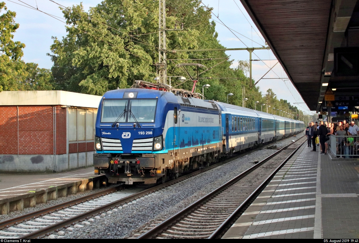 Mit dem EC 174 von Praha hl. n. nach Flensburg durchfährt 193 685-5 am 10.07.2023 den Bahnhof Elmshorn. Eigentümer der Lok ist RSL (Rolling Stock Lease s.r.o., Bratislava), zugelassen ist sie in Deutschland (UIC-Nr. 91 80 6193 685-5 D-RAILL). Horst Lüdicke