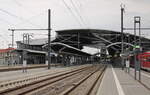 Blick auf das Empfangsgebäude Erfurt Nord. Das Empfangsgebäude ist in Privatbesitz. Der linke Gebäudeteil wurde mit Schallplatten verkleidet. Im Gebäude befinden sich ein Plattenladen und ein Nachtklub. Das Stellwerk ist noch besetzt soll aber 2028 durch ein ESTW ersetzt werden.