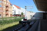 Der Prellbock am Bahnsteig 1 im Stadtbahnhof von Eschwege, am 26.07.2024.