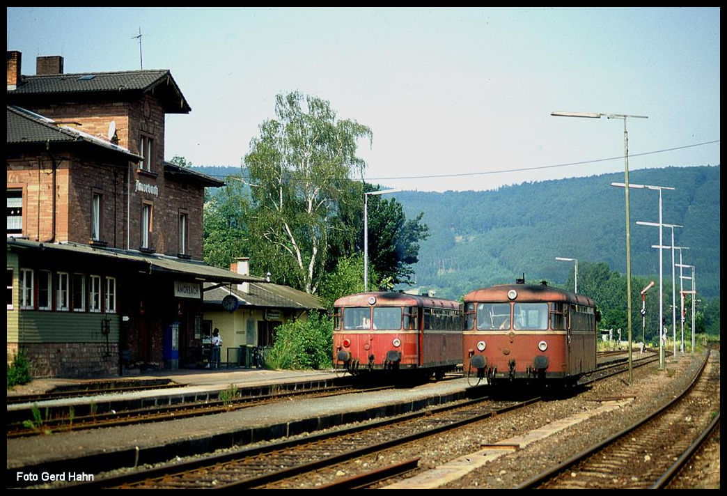 Zugkreuzung im Bahnhof Amorbach am 12.7.1991 um 10.40 Uhr: