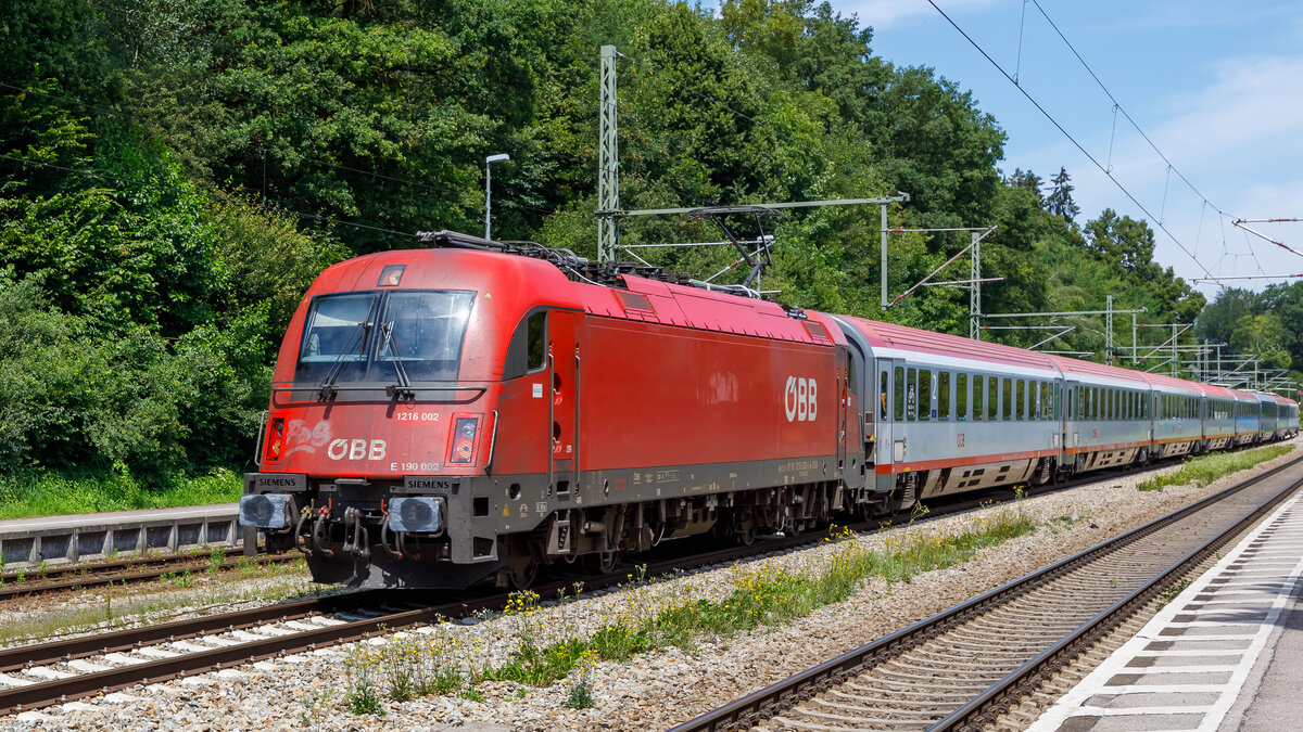 Mittlerweile kommen die Garnituren der neuen Railjet-Generation regelmäßig nach Bayern. Aufgrund der noch fehlenden Zulassung der Steuerwagen als führendes Fahrzeug muss jeweils eine Lokomotive an die Zugspitze gesetzt werden. Am 15.07.2024 ist 91 81 1216 011 in dieser Funktion vor einem RJ auf der Fahrt nach München im Bahnhof Aßling zu sehen. Mathias May