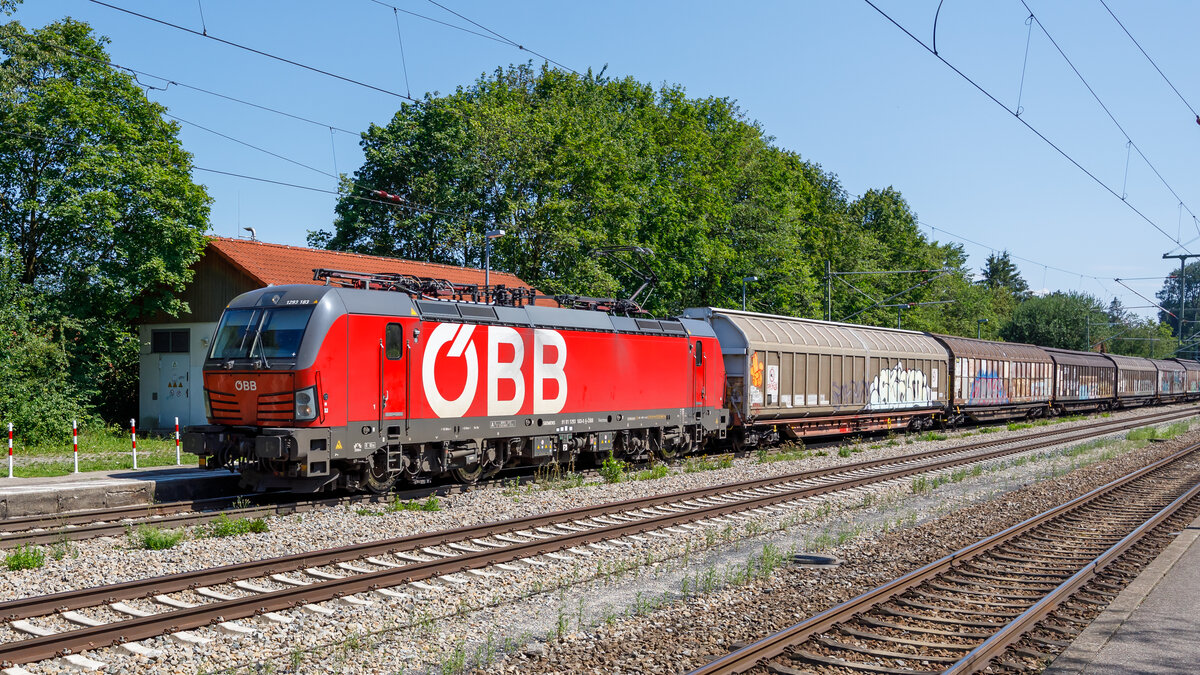 Bahnhof Aßling in Oberbayern am 15.07.2024. ÖBB-Vectron 91 81 1293 183 kommt mit einem Güterzug aus Richtung Rosenheim um nach München weiterzufahren. Mathias May